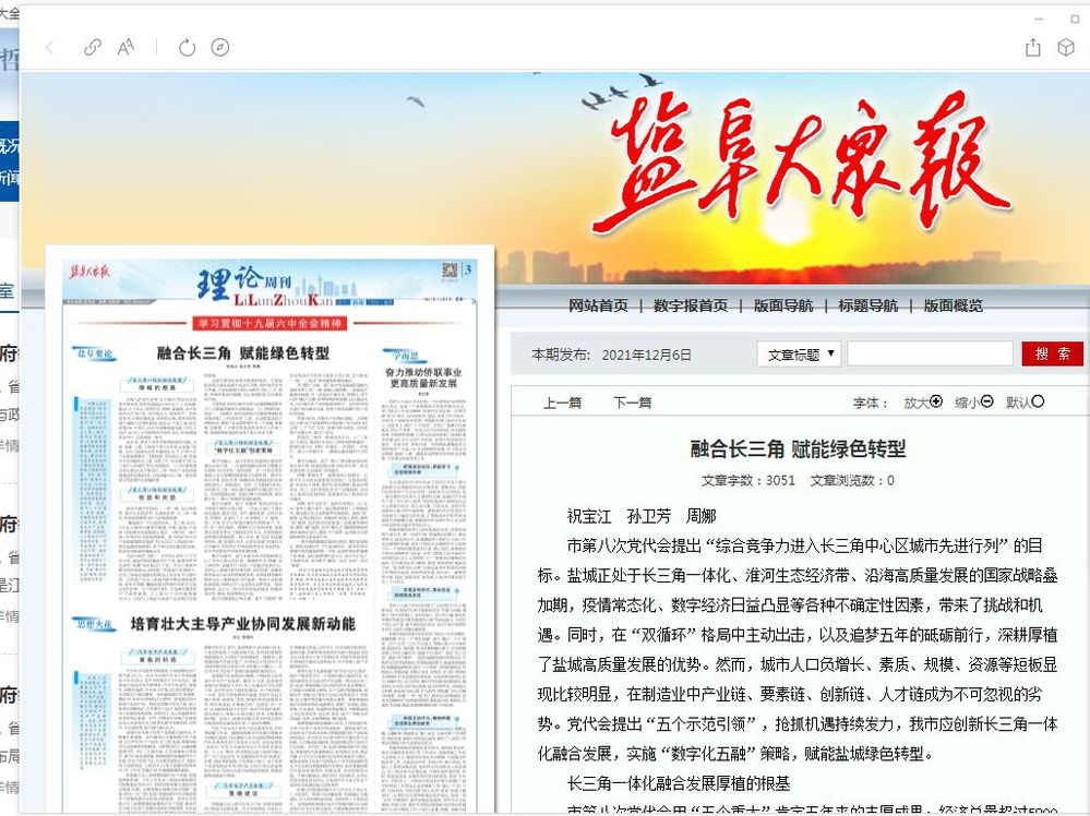 12月6日,《盐阜大众报》理论周刊版刊发了由我校盐城产教融合发展研究中心智库、经贸管理学院祝宝江教授、我校副校长孙卫芳教授、经贸管理学院周娜老师合作撰写的研究报告《融合长三角 赋能绿色转型》,此文围绕盐城市第八次党代会提出“综合竞争力进入长三角中心区城市先进行列”的目标。研究了盐城正处于长三角一体化、淮河生态经济带、沿海高质量发展的国家战略叠加期,疫情常态化、数字经济日益凸显等各种不确定性因素,带来了挑战和机遇。同时,在“双循环”格局中主动出击,以及追梦五年的砥砺前行,深耕厚植了盐城高质量发展的优势。然而,城市人口负增长、素质、规模、资源等短板显现比较明显,在制造业中产业链、要素链、创新链、人才链成为不可忽视的劣势。党代会提出“五个示范引领”,抢抓机遇持续发力,我市应创新长三角一体化融合发展,实施“数字化五融”策略,赋能盐城绿色转型。