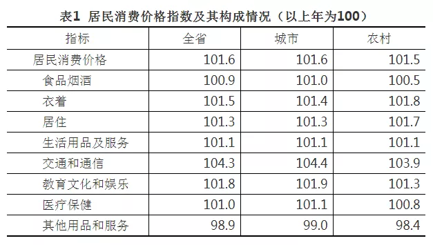 居民消费价格温和上涨。全年居民消费价格比上年上涨1.6%,其中城市上涨1.6%,农村上涨1.5%。分类别看,食品烟酒类上涨0.9%,衣着类上涨1.5%,居住类上涨1.3%,生活用品及服务类上涨1.1%,交通通信类上涨4.3%,教育文化娱乐类上涨1.8%,医疗保健类上涨1.0%,其他用品和服务类下降1.1%。食品中,粮食上涨0.8%,食用油上涨6.3%,鲜菜上涨6.8%,水产品上涨14.0%,蛋类上涨12.5%,畜肉类下降15.0%。全年工业生产者出厂价格比上年上涨6.3%,工业生产者购进价格上涨13.8%。