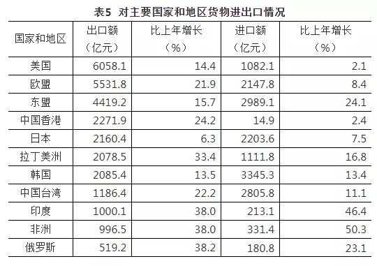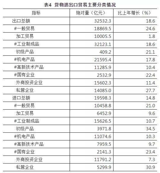 对外贸易保持快增。全年实现进出口总额52130.6亿元,比上年增长17.1%。其中,出口32532.3亿元,增长18.6%;进口19598.3亿元,增长14.8%。从贸易方式看,一般贸易进出口总额29328.3亿元,增长23.3%;占进出口总额比重达56.3%,超过加工贸易24.7个百分点。从出口主体看,国有企业、外资企业、私营企业出口额分别增长22.4%、11.4%和27.7%。从出口市场看,对美国、欧盟、日本出口分别增长14.4%、21.9%和6.3%,对印度、俄罗斯、东盟出口分别增长38%、38.2%和15.7%。从出口产品看,机电、高新技术产品出口额分别增长17.8%、10.4%。对“一带一路”沿线国家出口保持较快增长,出口额8924.9亿元,增长20.8%;占全省出口总额的比重为27.4%,对全省出口增长的贡献率为30.1%。