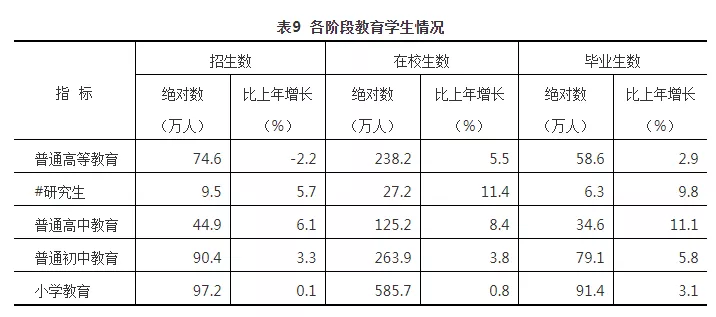 教育事业全面发展。全省共有普通高等学校168所(含独立学院)。普通高等教育本专科招生数65.2万人,在校生数211.1万人,毕业生数52.4万人;研究生招生数9.5万人,在校生数27.2万人,毕业生数6.3万人。全省中等职业教育在校生数64.1万人(不含技工学校)。特殊教育学校招生数0.3万人,在校生数2.0万人。全省共有幼儿园8116所,比上年增加213所;在园幼儿252.5万人,比上年减少1.6万人。