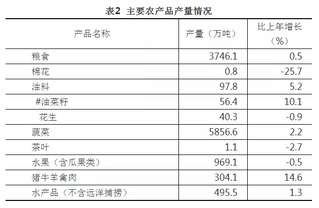 种植业结构持续优化。全年粮食播种面积542.8万公顷,比上年增加2.2万公顷;棉花种植面积0.6万公顷,减少0.3万公顷;油料种植面积29.6万公顷,增加1.8万公顷;蔬菜种植面积145.3万公顷,增加0.9万公顷。农业综合生产能力持续增强,全年粮食总产量再创新高,达3746.1万吨,比上年增产17.0万吨,增长0.5%。其中,夏粮1380.7万吨,增长0.5%;秋粮2365.4万吨,增长0.4%。粮食亩产460.1公斤,比上年增加0.2公斤,增长0.1%。