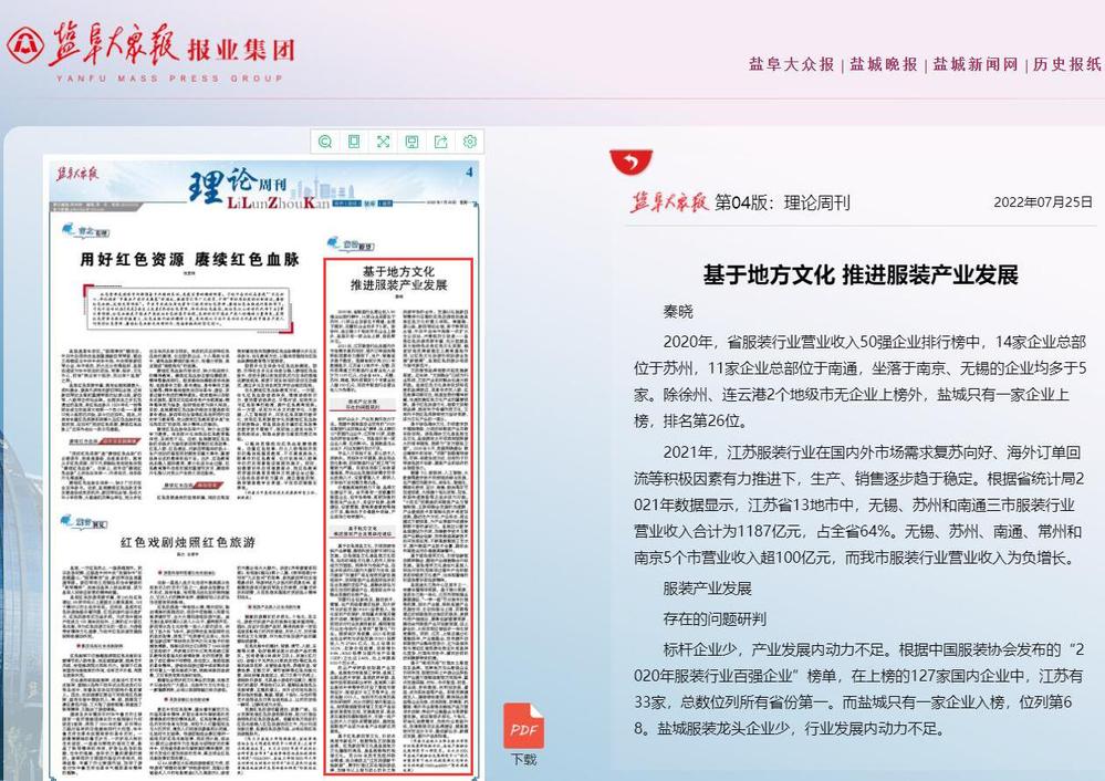 7月25日,《盐阜大众报》理论周刊版刊发了由我校盐城产教融合发展研究中心研究员、纺织服装学院副书记秦晓撰写的研究报告《基于地方文化 推进服装产业发展》。
