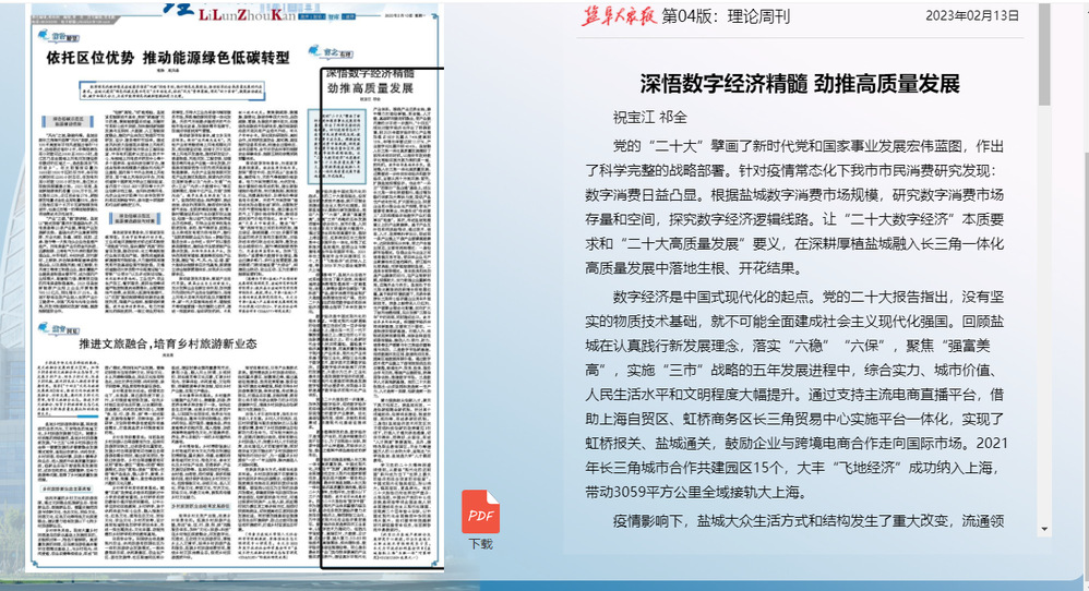 2月13日,《盐阜大众报》理论周刊版刊发了由我校经贸管理学院、盐城产教融合发展研究中心研究员祝宝江教授和我校实习研究员祁全老师合作撰写的研究报告《深悟数字经济精髓 劲推高质量发展》。